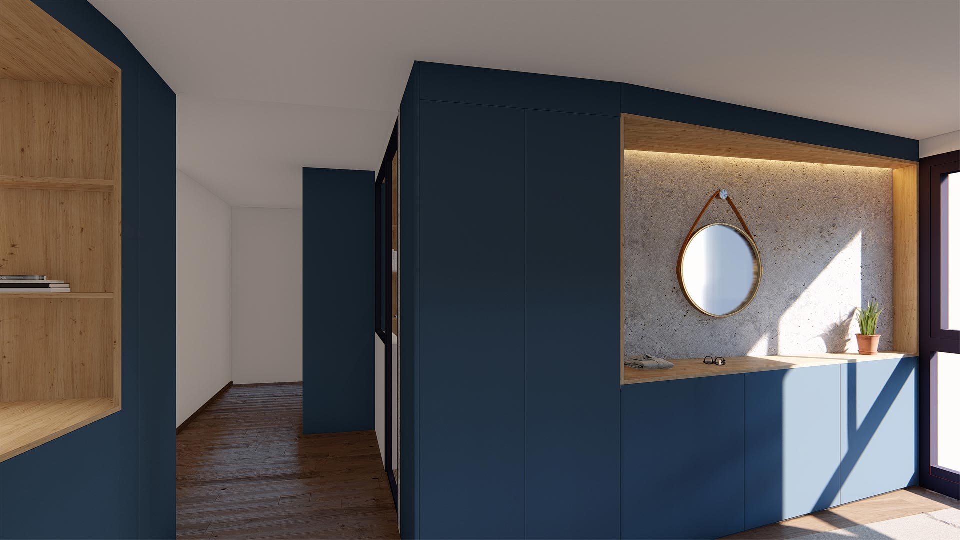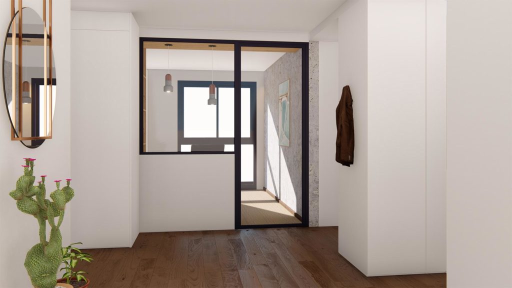 Ce projet d’aide à la projection a pour but de repenser totalement l’entrée de l’appartement actuellement non définie, afin de mieux délimiter les espaces tout en créant un grand dressing et un bureau.