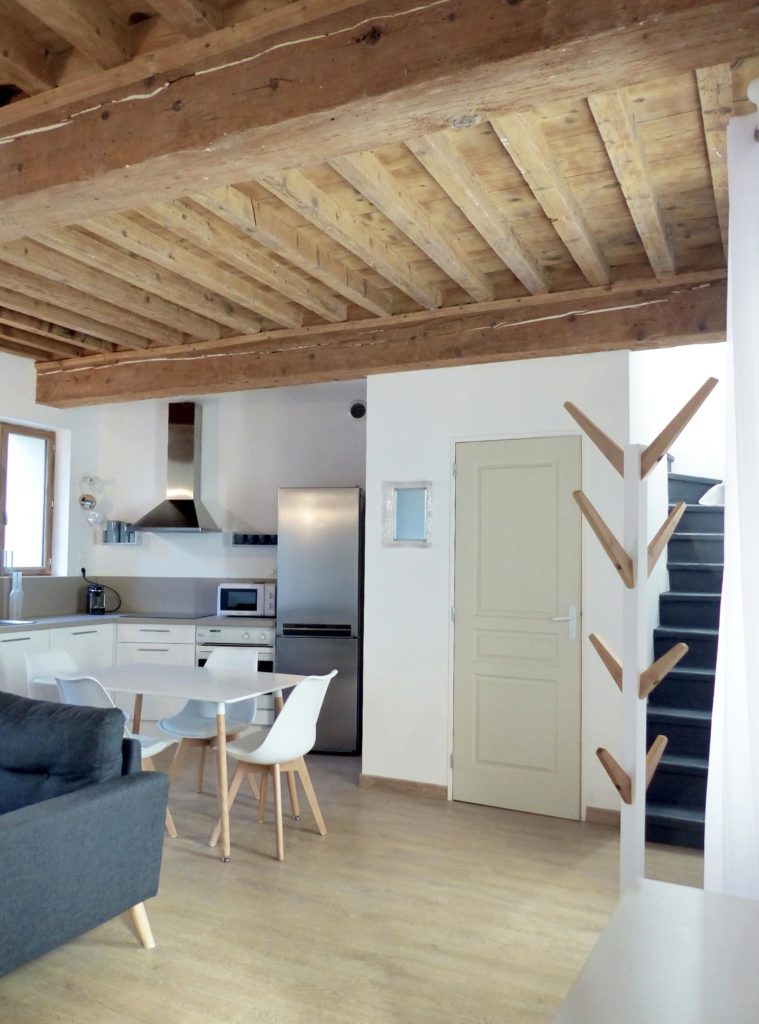 Les plafonds et poutres en bois ont été conservés tels quels, simplement sablés, ils apportent une esthétique typique à la maison tout en conservant l’histoire du bâti.